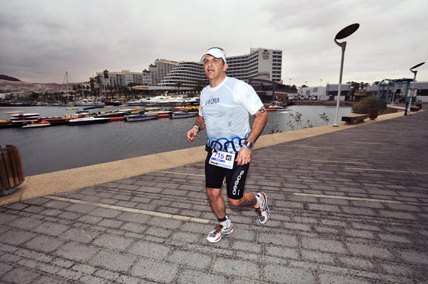 Amir Nachum (M45-49) runs past the Eilat Marina.