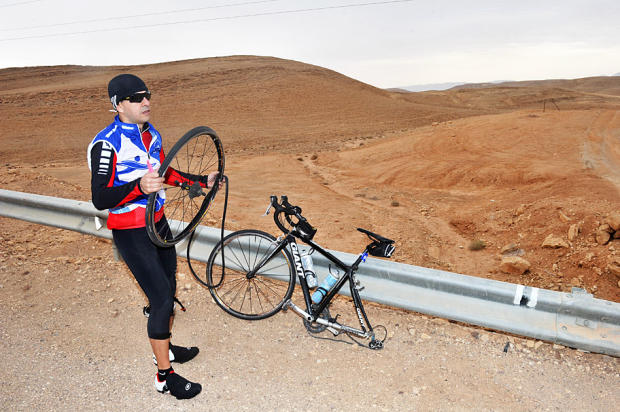 Fixing a flat on the desolate road.