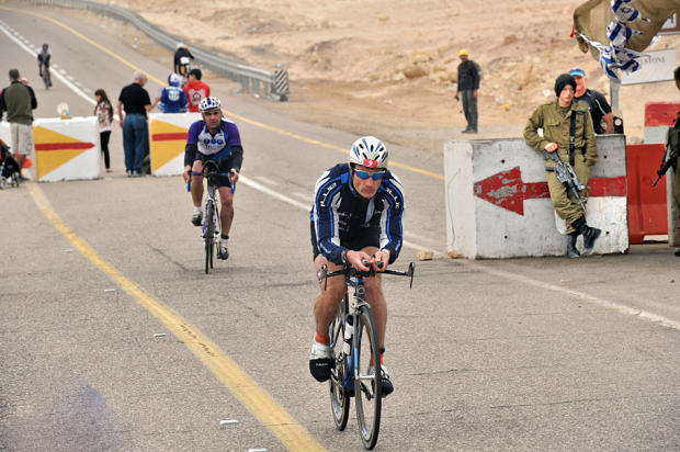 Yoram Levav (M50-54) rides into T2. Note the armed Israeli soldier at the concrete barrier at the top right of the picture.