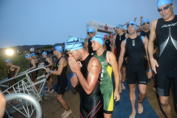 Joe Gambles offers what looks like a prayer before the race. Gambles sought his first Ironman 70.3 podium after a 4th, 5th and 4th in previous years. This year, in a rain, his prayer was answered.