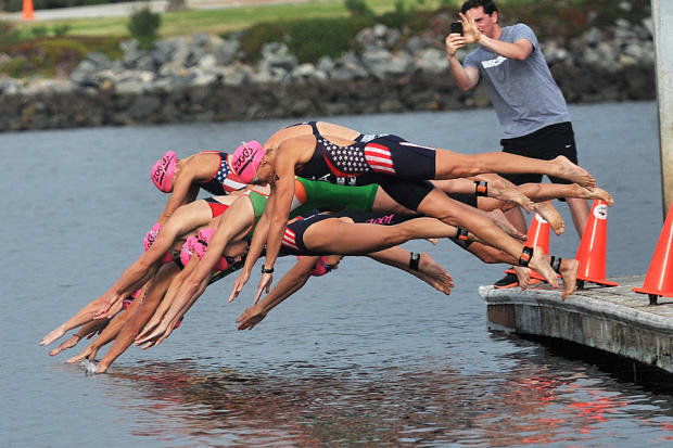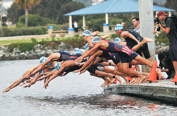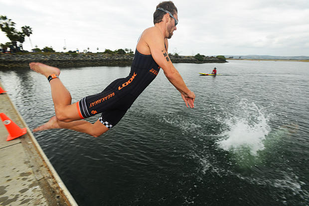 A competitor leaps into Mission Bay at the start of the second swim leg of the Super Sprint Triathlon.