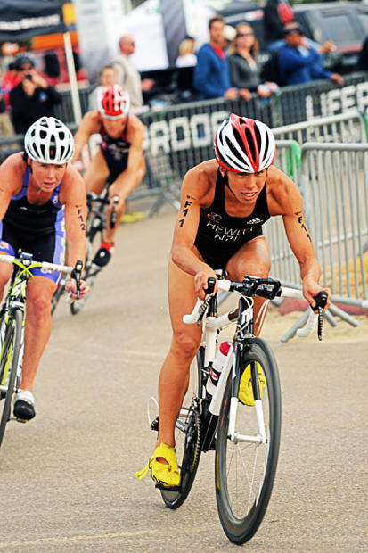 Andrea Hewitt fixes her race number tattoo before finishing 3rd in the women's event.