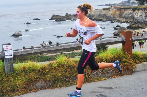 Age group woman, in Flashdance ensemble, runs above the Pacific Grove shoreline.