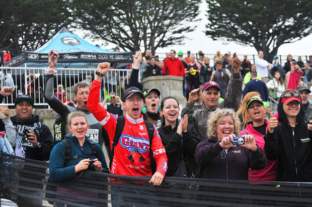 Spectators cheer the hardy triathletes.