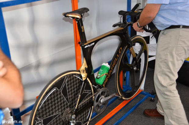 The Pinarello Bolide of Bradley Wiggins gets checked to make sure the bike is UCI correct.
