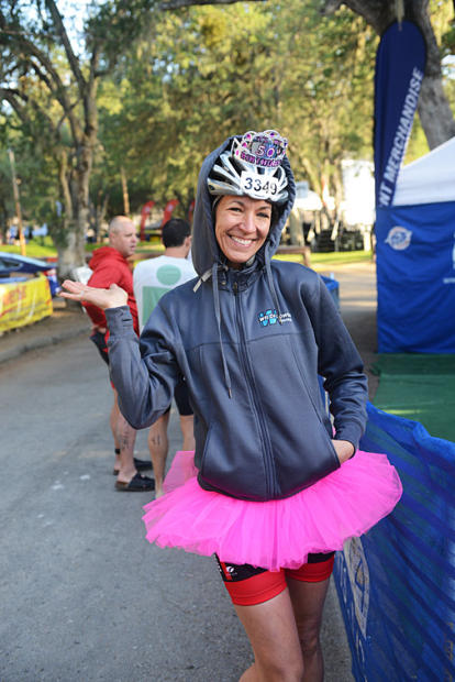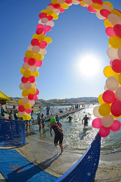 Balloon arch marks the swim finish.