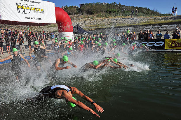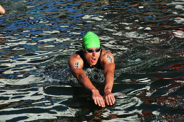 Age group men's swim start is a whirl of chaos and intensity.