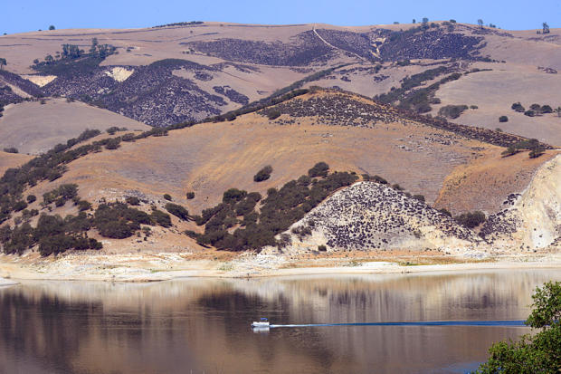 A small boat cuts a sharp wake on Lake San Antonio's glassy surface.