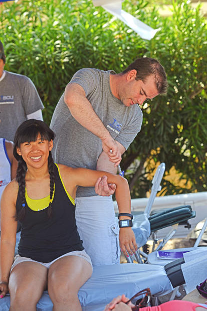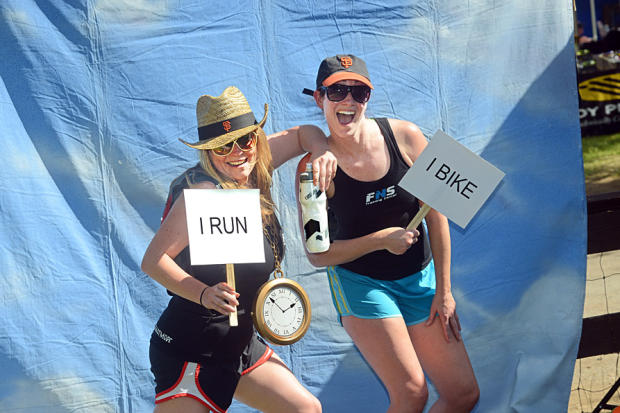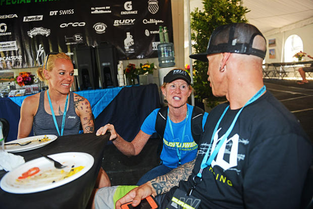 Tri-California announcer Julie Moss chats with defending champion Heather Jackson and her fiancé Sean Watkins.