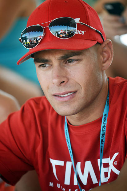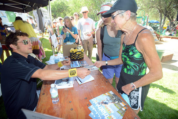 Harriet Anderson, the great Ironman Hawaii age group champion, is also a fan. Here she gets Jesse Thomas's autograph.