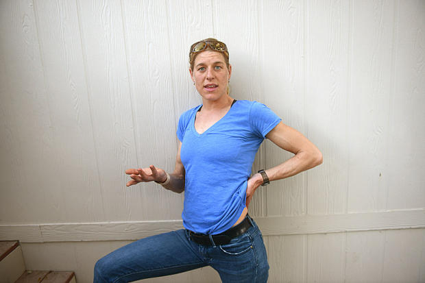 Michellie Jones, who will announce the race, models some fashionable compression socks.