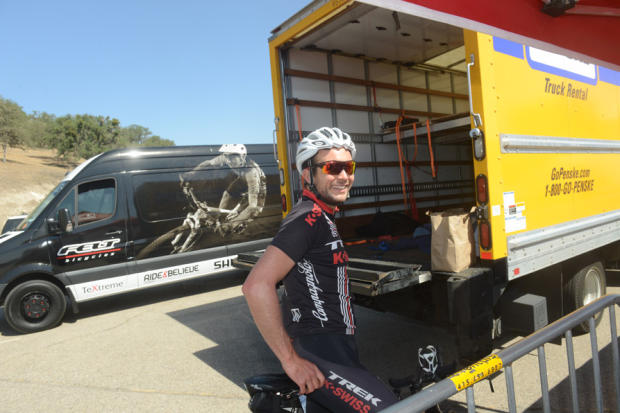 Joe Gambles waits for race wheels that arrived via a triathlon transport service..