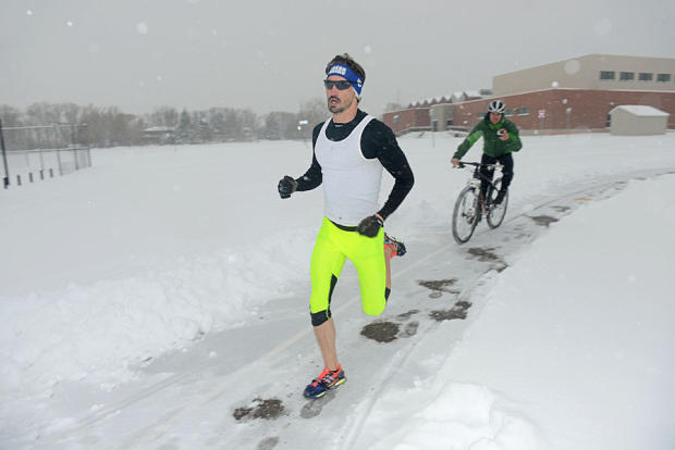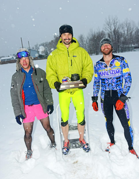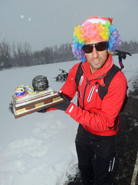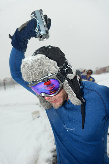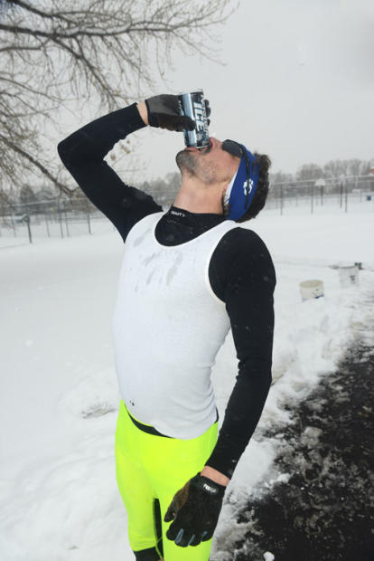 A fixture in North Boulder since 2007, there were a few hardy Boulder Beer Mile competitors who braved an 11-inch snowfall and 15-degree Fahrenheit temperatures Saturday afternoon. The basic rules: Competitors must drink one 12-ounce can of approximately 4% to 5% alcohol content before each 400-meter lap. To prove they consumed the entire can, competitors must hold the empty can over their head before taking off on each lap. If any competitor throws up or “chunders” while consuming the beer, they must complete an extra penalty lap for an official finish.