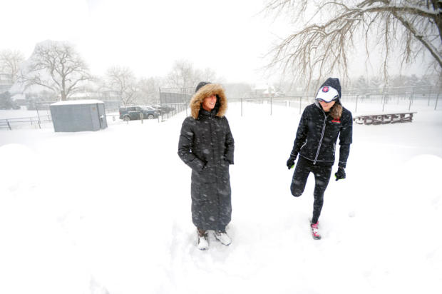 Ellen Howard, a marathon and 10k runner, adjusts what looks like snow-repellent gaiters before the race.