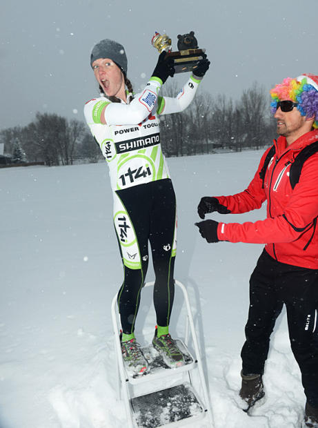 Race announcer and referee Billy Edwards displays the elegant Boulder Beer Mile trophy.