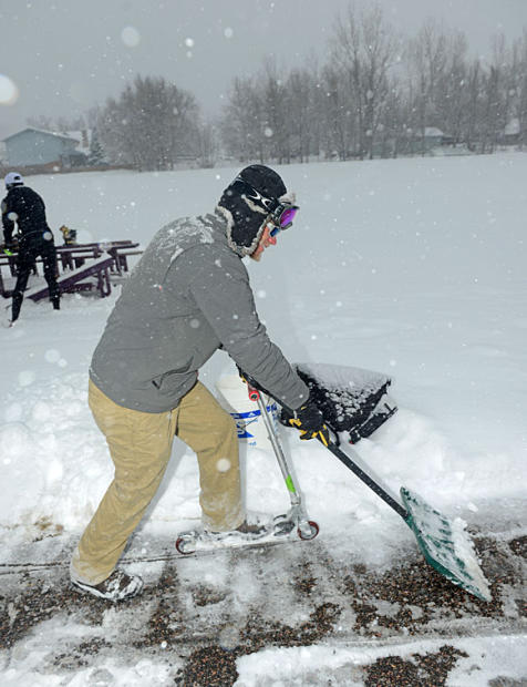 Competitor Nick Przbysz pitches in with clearing the track of snow before the race. Note the adept use of razor scooter and shovel.