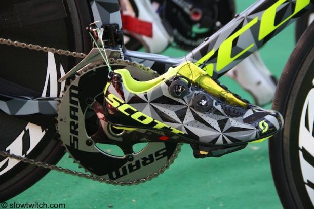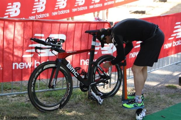 The shoes and bike of Ironman 70.3 World Champion Sebastian Kienle awaits the pilot.
