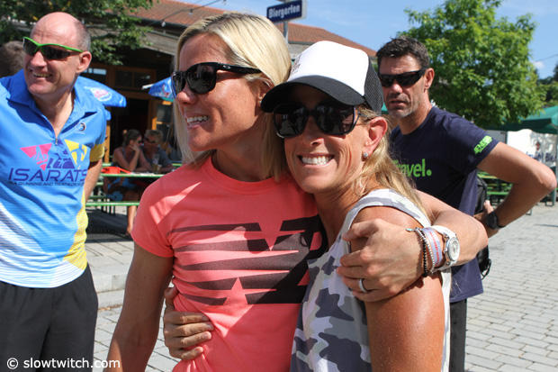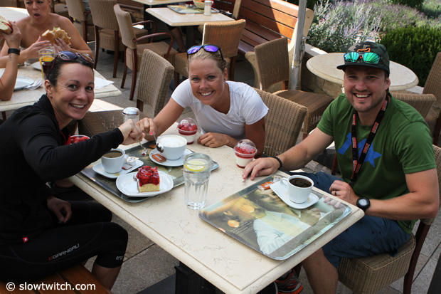 Rachel Joyce, Michelle Vesterby and Claus from Challenge Denmark enjoy coffee and sweets at Bäckerei Schmidt after the swim. The strawberry cake however is mine.