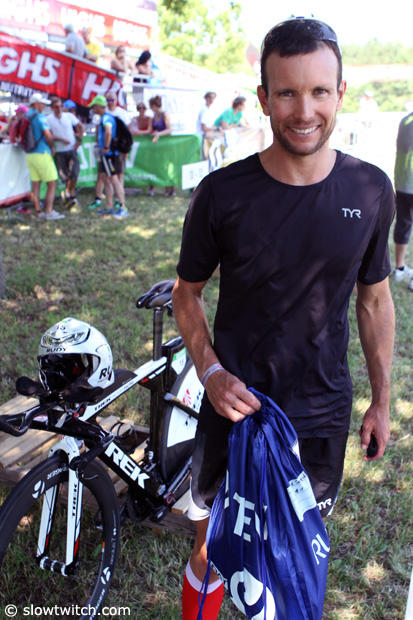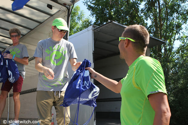 After hugging a bunch of the volunteers he finally dropped off his run transition bag.