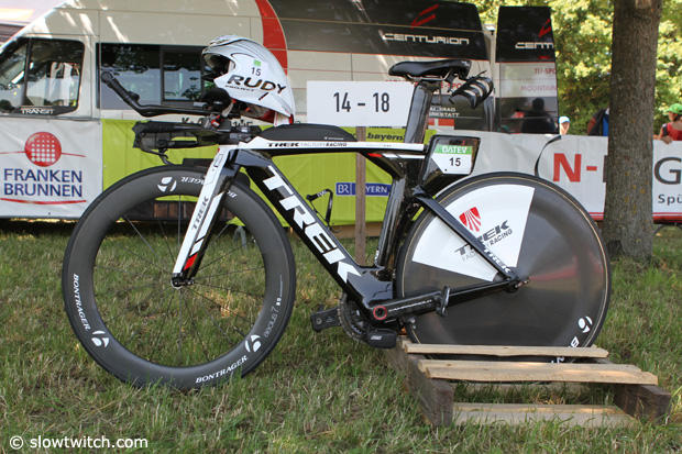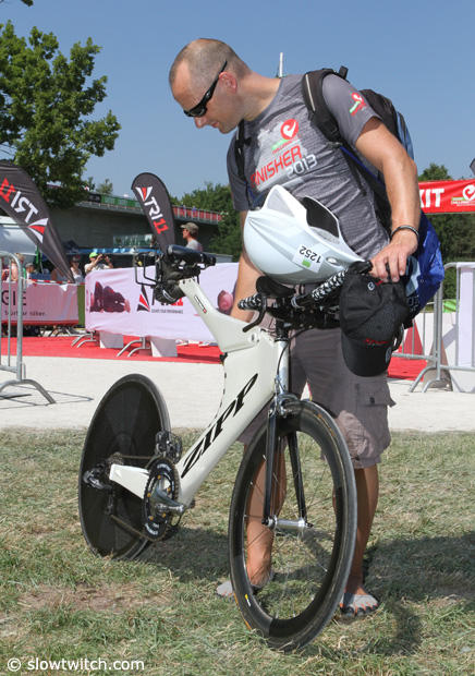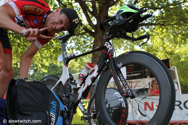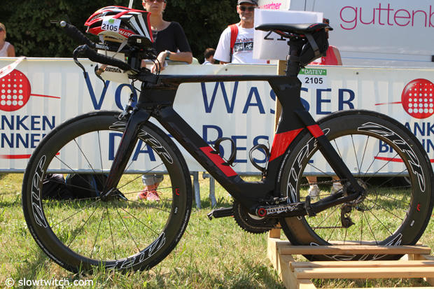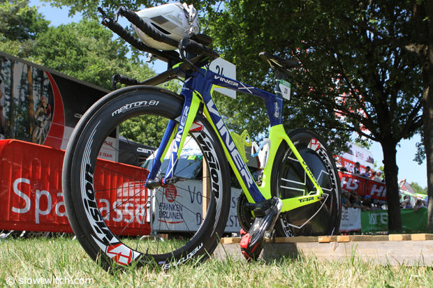 This year Felix Walchshöfer will race here and that is his bike. He has never raced in Roth before, and the bib number represents his father's May 21st birthday.