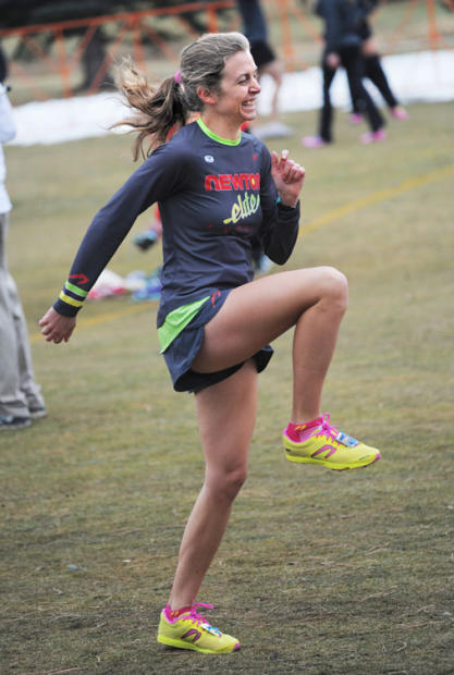 Jenny Simpson, two time Olympian and gold medalist in the 1500 meters at the 2011 World Track and Field Championship, warms up.