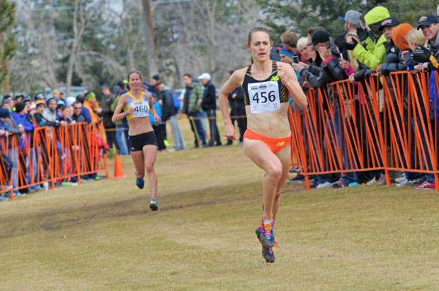 Jenny Simpson (456) sprints to a second place finish in 27:57, 4 seconds ahead of third place finisher Mattie Suver (460).