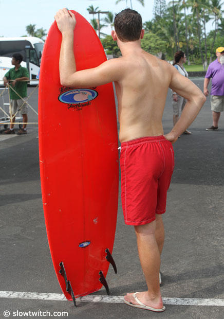 This surfer is not waiting for a wave, he is waiting for crowds from the cruise ship who want to have a pic taken with a surfer guy.