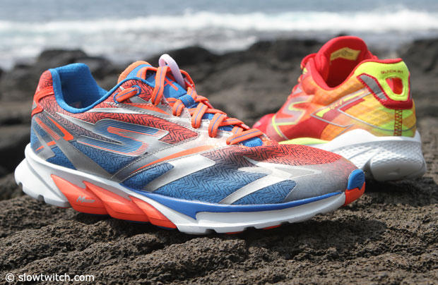 The Skechers GoRun 4 and GoRun Ride 4 have a drainage hole at the bottom and a heel loop – making them triathlon friendly.