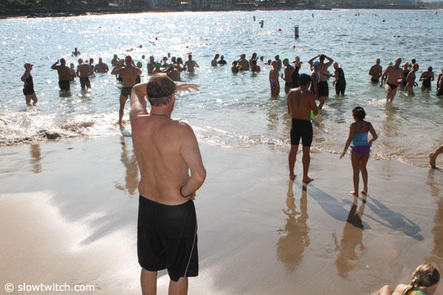 The defending champion Frederik Van Lierde swam at the pier this morning, and was surrounded by fans and friends.