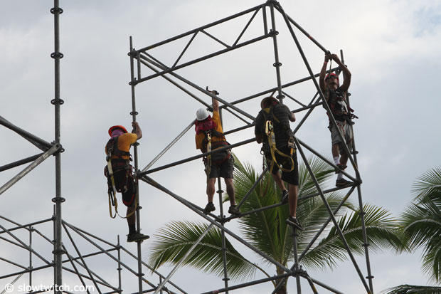 Meanwhile folks are working hard to get the finish area prepped for the big day. These tall big screen towers do not just go up magically.