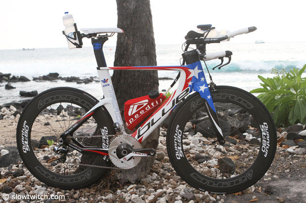 Blue brought this Red, White and Blue bike to Kona, and it is meant for a military benefit raffle – thus the uncut steerer and all the spacers.