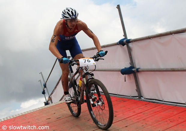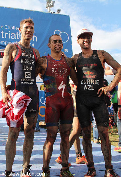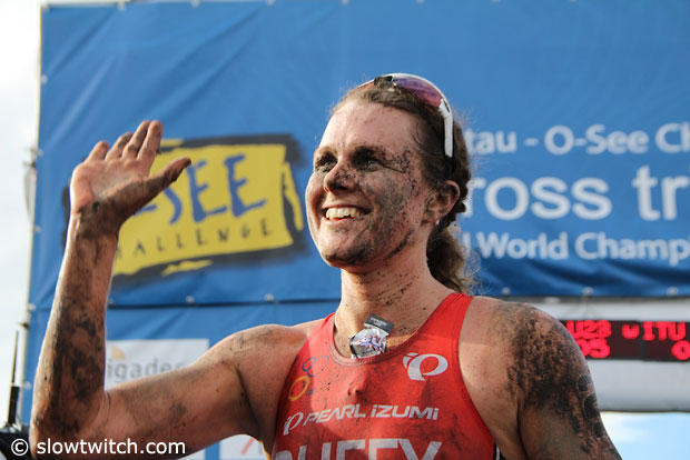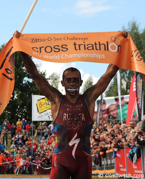 Ruben Ruzafa was thrilled with his first ITU Cross Worlds title, after 2 XTERRA Worlds ones. He appears to hold a gel in his mouth in case you wondered.