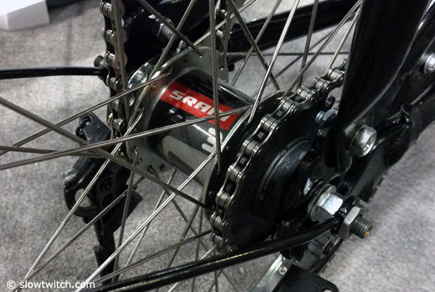 We spotted this 3-speed hub on the World Bicycle Relief Buffalo bike and when the coaster brake is applied it automatically shifts back to first gear.