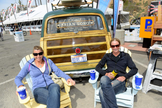 Julie Dibens and her able PR liaison/agent Wendy Ingraham relax in front of a classic Woody station wagon at the expo.