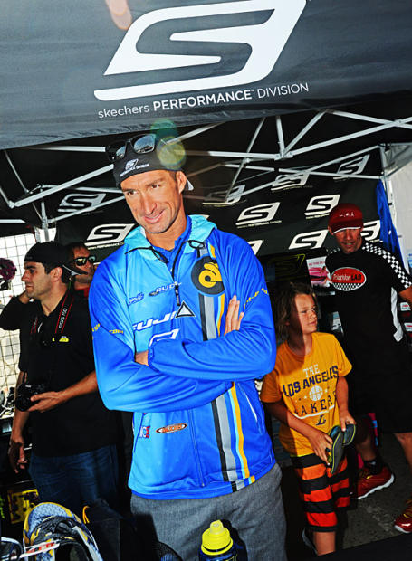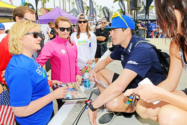 American uberbiker Andrew Starykowicz high fives a fan at the autograph table. Yes, he plans to kamikaze the bike and hang on as he did in Panama 70.3.