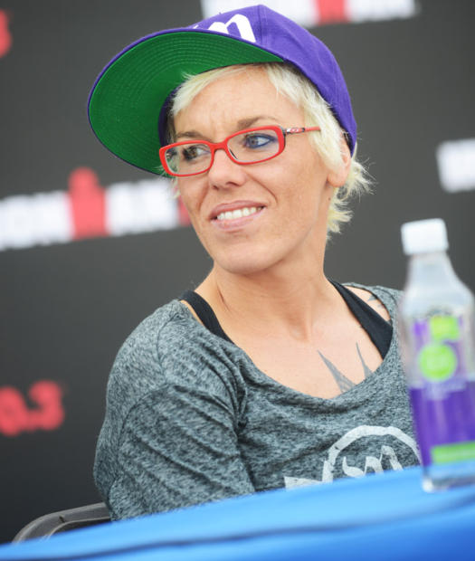 Defending Ironman 70.3 California champion Heather Jackson at the press conference.