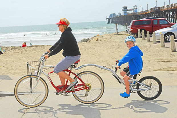 Mother and child ride a tandem past the Oceanside pier.