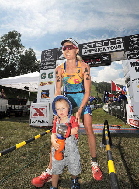 Emma Garrard celebrates her finish with her young child.