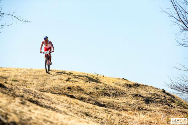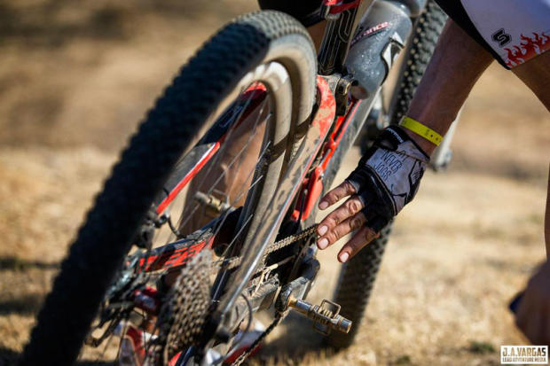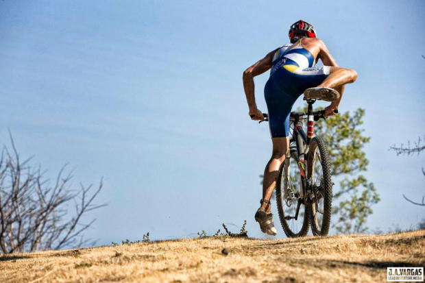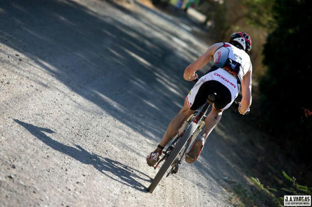 Here Leonardo Chacon charges up a hill in an adjusted cyclocross style.
