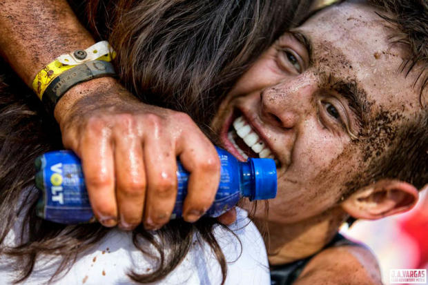 A big muddy hug from 3rd place male Mauricio Mendez.