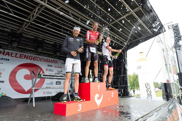 The champagne spraying men's podium at the 2015 Challenge Denmark Half.