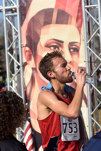 Chris Derrick drinks some water after winning his 3rd straight USATF Cross Country National Championship in a time of 36:18.
