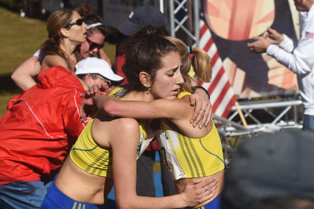 Competitors in Open Women 8k hug after the race.