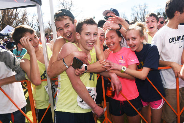Friends congratulate Eric Hamer of Monument, Colorado after finishing 4th in the Junior Men 8k in a time of 25:49.