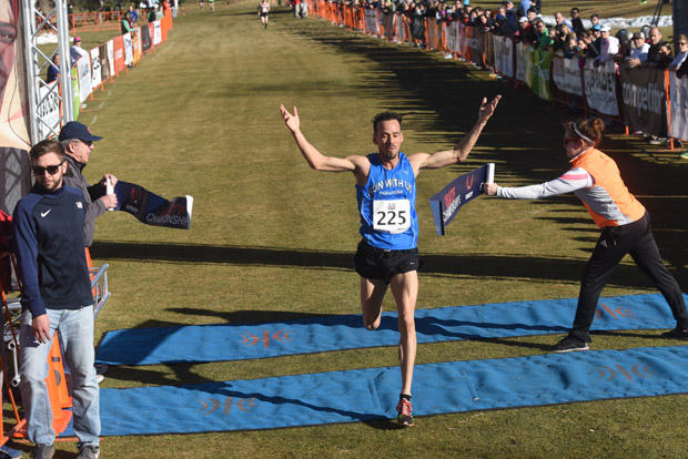 Chris Derrick drinks some water after winning his 3rd straight USATF Cross Country National Championship in a time of 36:18.