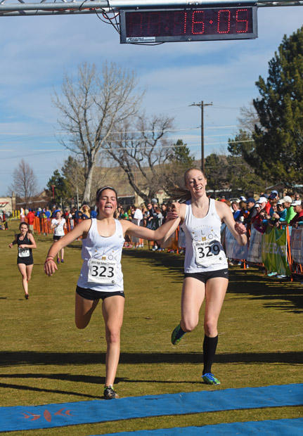 Brianne Nelson of Golden, Colorado (677) and Laura Thweatt of Superior, Colorado (703) take early lead in Open Women 8k. Thweatt won in 27:42.