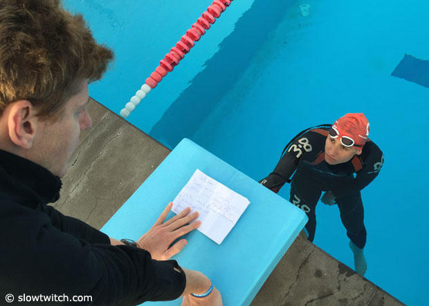 But there are not only long course athletes training here. ITU athlete Jelle Geens is paying attention to his swim coach.