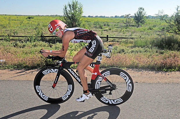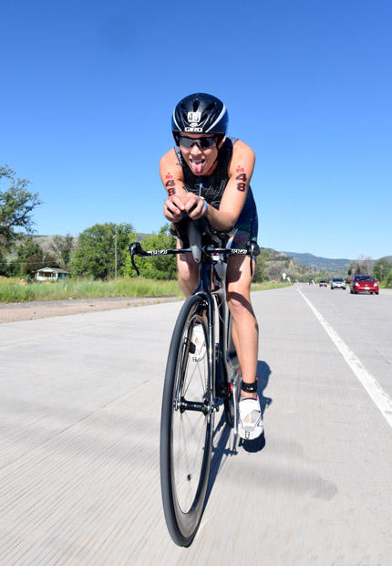 Alicia Kaye gives it the Michael Jordan tongue hanging out look as she pushed her aerodynamic Ventum to the women’s-best 2:15:40 bike split.