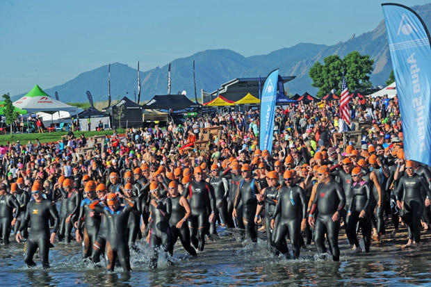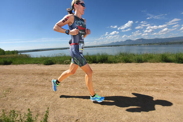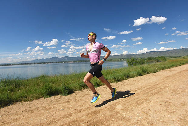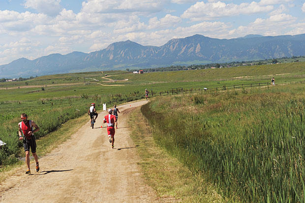 Running toward the Flatirons on the Boulder 70.3 run course.