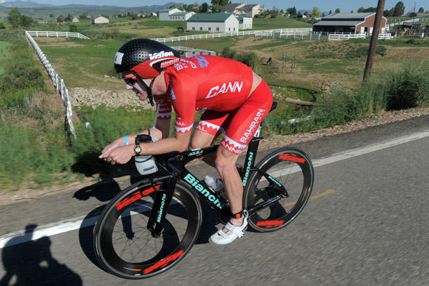Paul Ambrose rides past a Boulder County farm on his way to a 2:07:11 bike split and 7th place.
